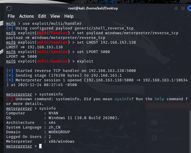 用 msfvenom 生成一个 Windows 的反弹木马(payload.exe),它会在目标电脑上运行后,主动回连到我们的攻击机。所以我们得在生成时填上自己机器的 IP 和监听端口——因为连接是从对方内网主动发起的,很多防火墙不会拦截这种“向外”的请求。