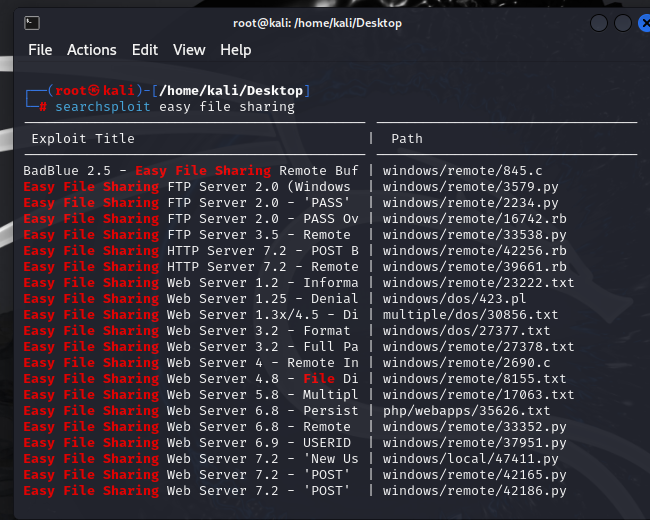 searchsploit easy file sharing:在本地漏洞数据库中搜索所有与 “Easy File Sharing” 相关的已公开漏洞和对应的利用脚本(exploit)