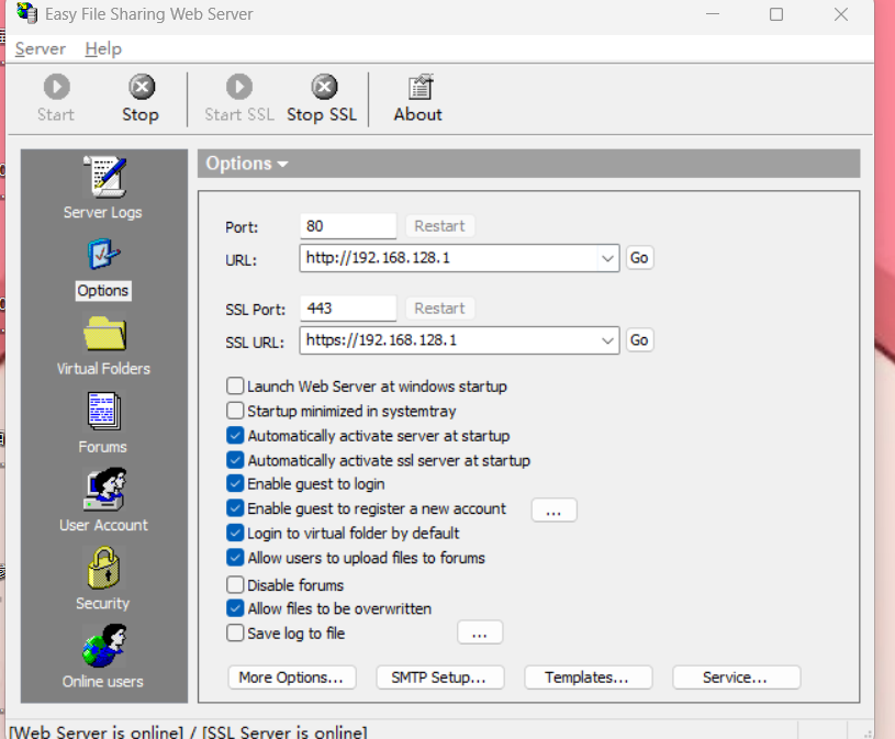 启动Easy File Sharing Web Server服务,这里的端口不可以与其他端口重复