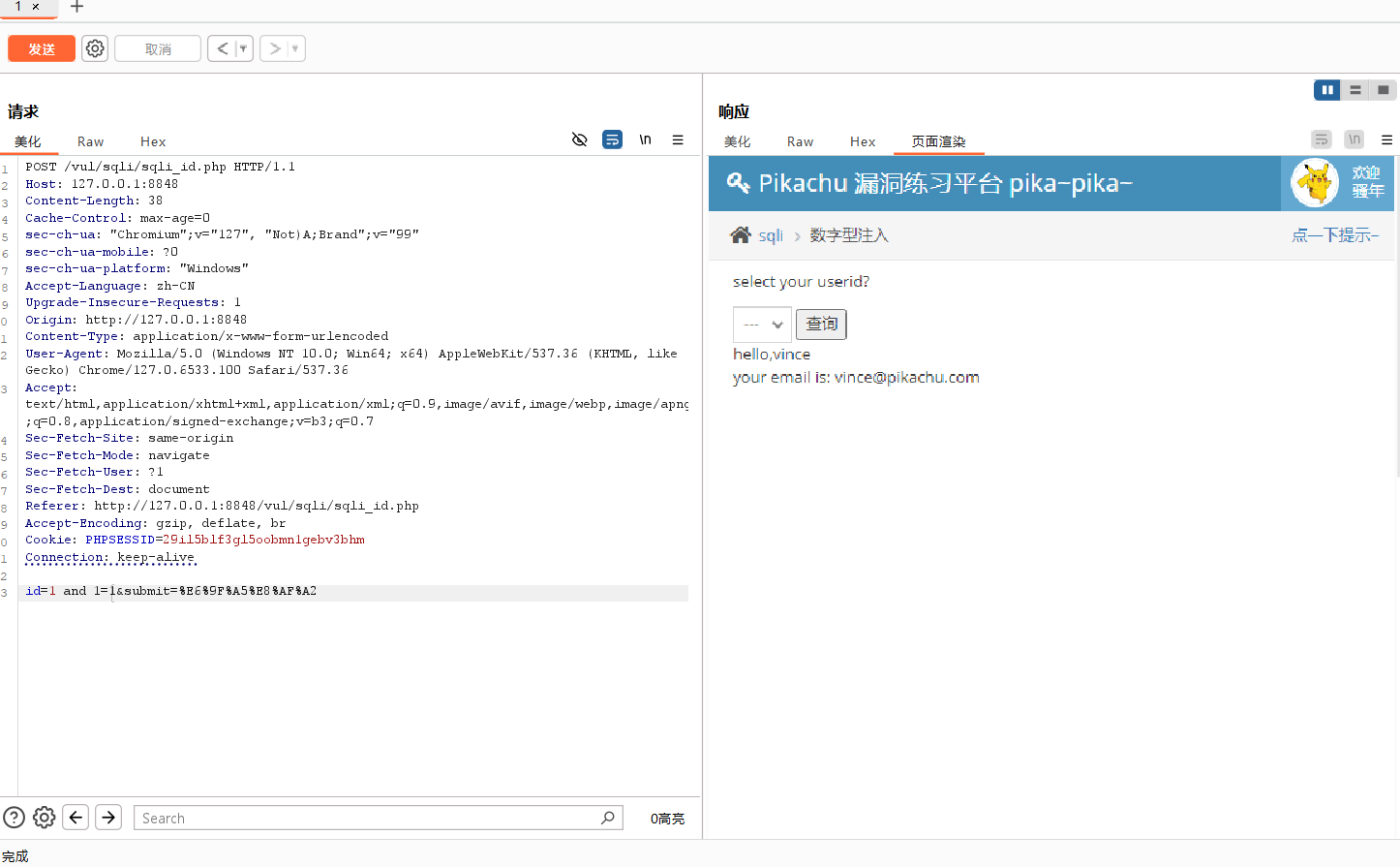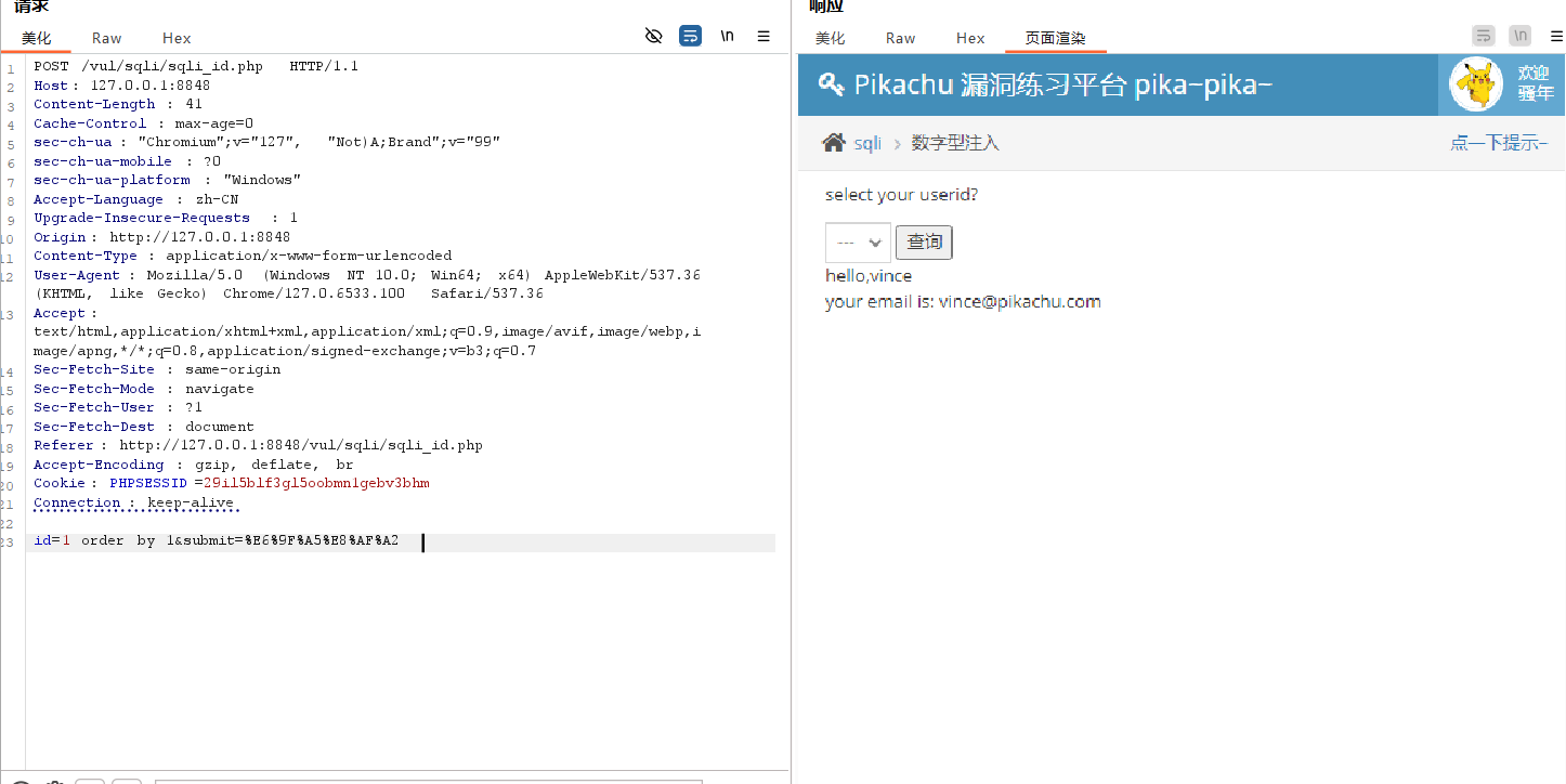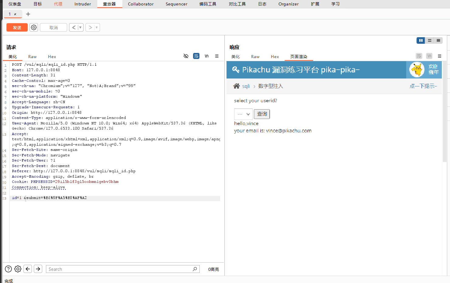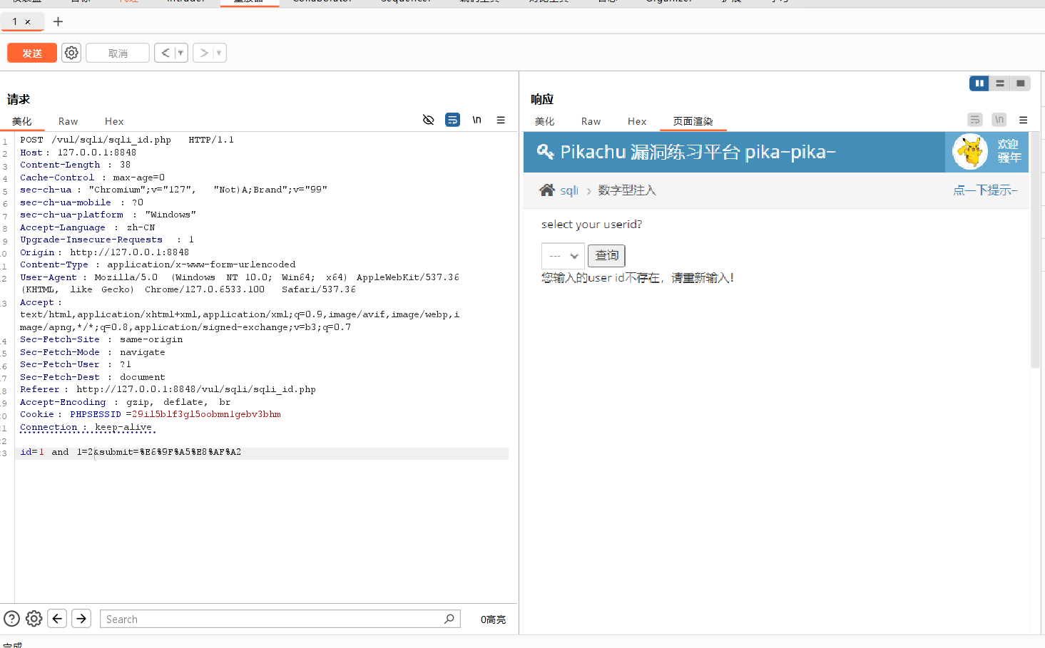查询是否存在注入点:(1)id=1 and 1=1&submit=%E6%9F%A5%E8%AF%A2页面正常回显;(2)id=1 and 1=2&submit=%E6%9F%A5%E8%AF%A页面回显错误,说明存在注入点