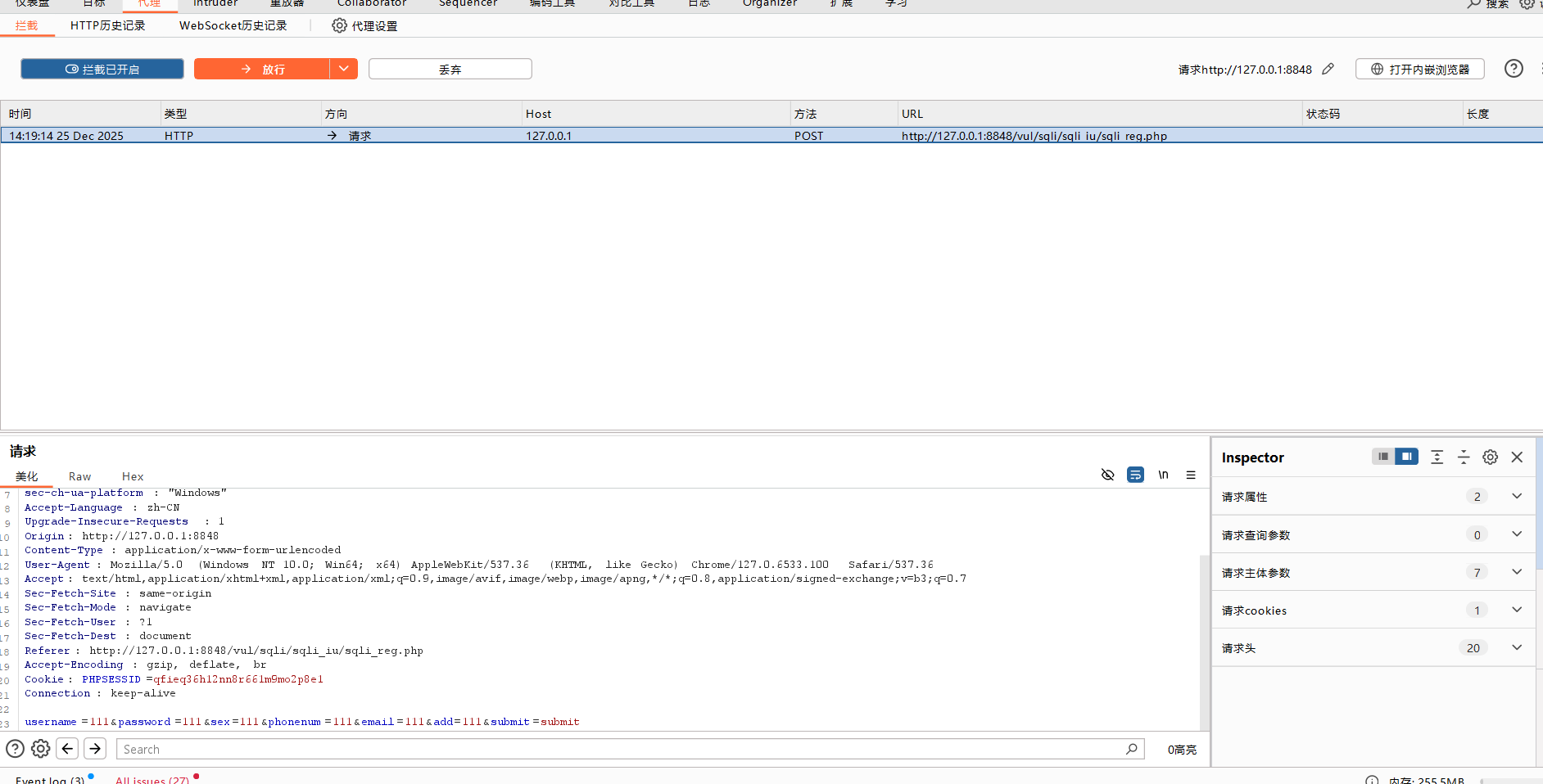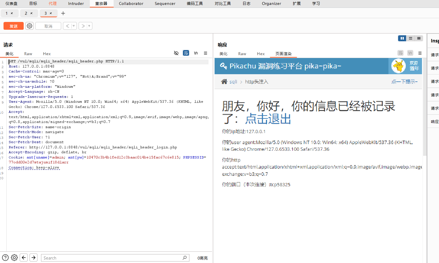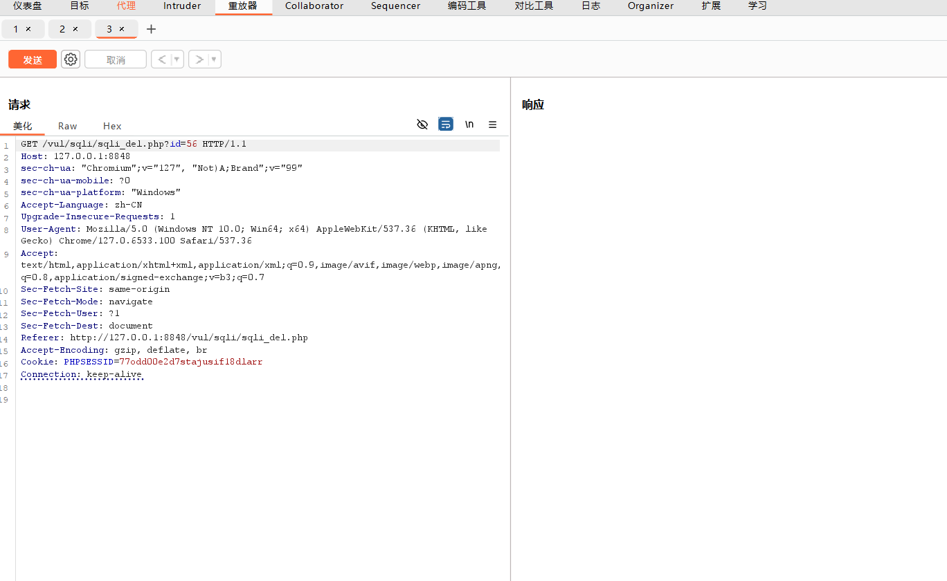 先在留言板进行留言,然后打开bp抓包,点击删除,在将抓包到的内容发送到重放器。