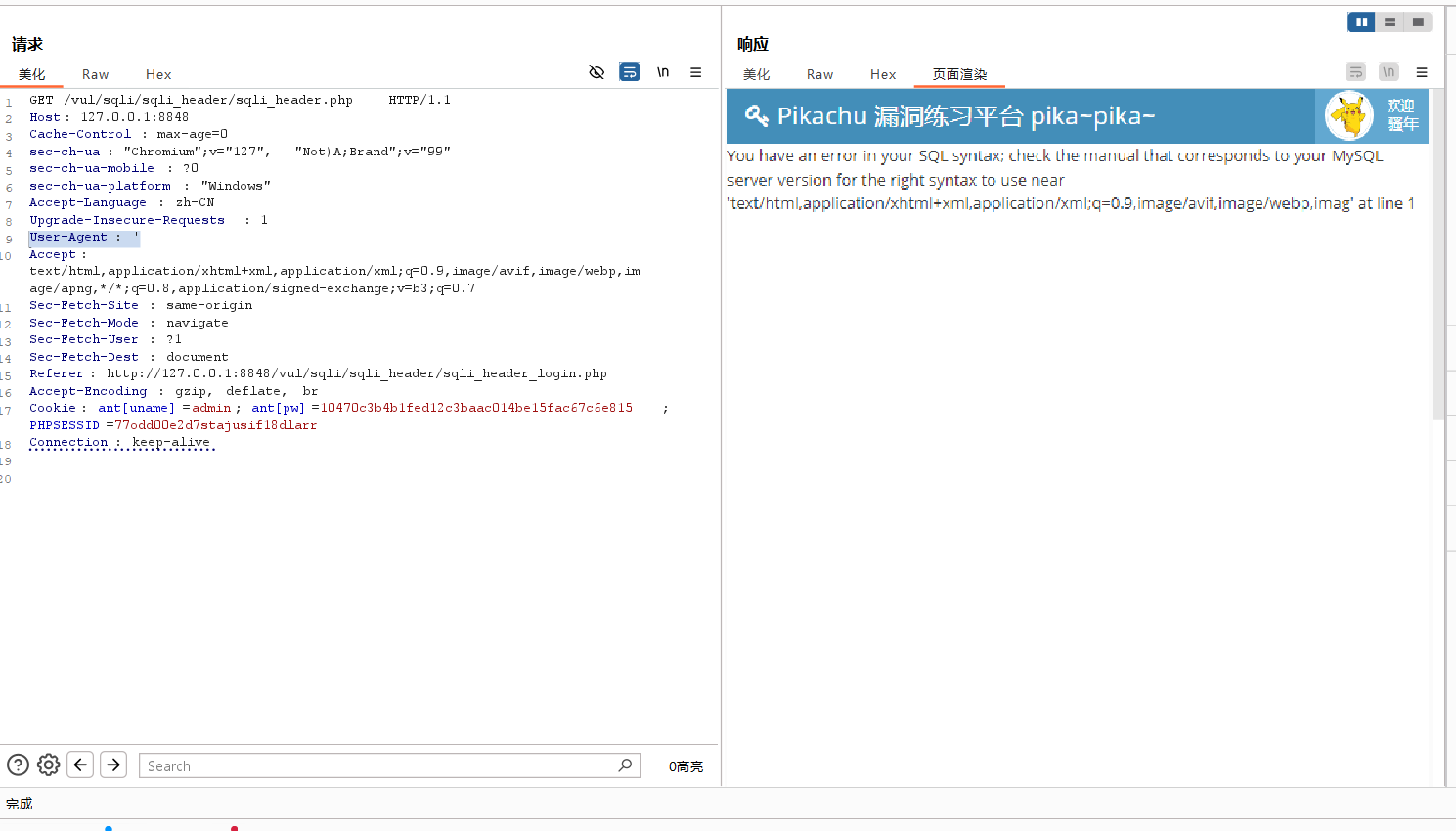 进行抓包查看一下:尝试在User-Agent中进行注入,User-Agent: '