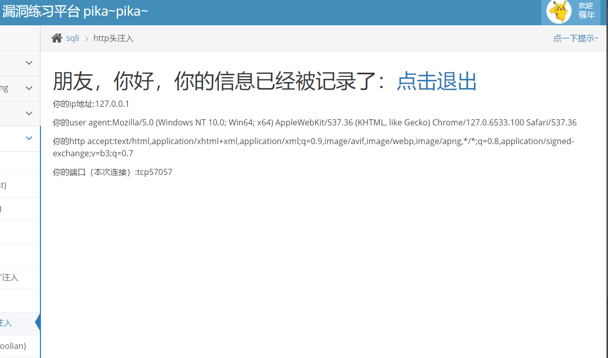 根据标题可以看到是根据http头部进行注入,先尝试使用admin正常登录看看,跳出了一个信息被记录的提示,并且登录进去之后有回显http request报文头