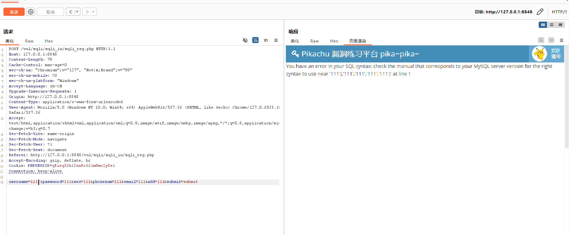 首先进行useename进行测试:username=111'&password=111&sex=111&phonenum=111&email=111&add=111&submit=submit报错信息的意思是说,输入111’后导致闭合出现错误,原本的应该为('[用户名]','[密码]','[性别]','[电话]','[邮箱]','[地址]')