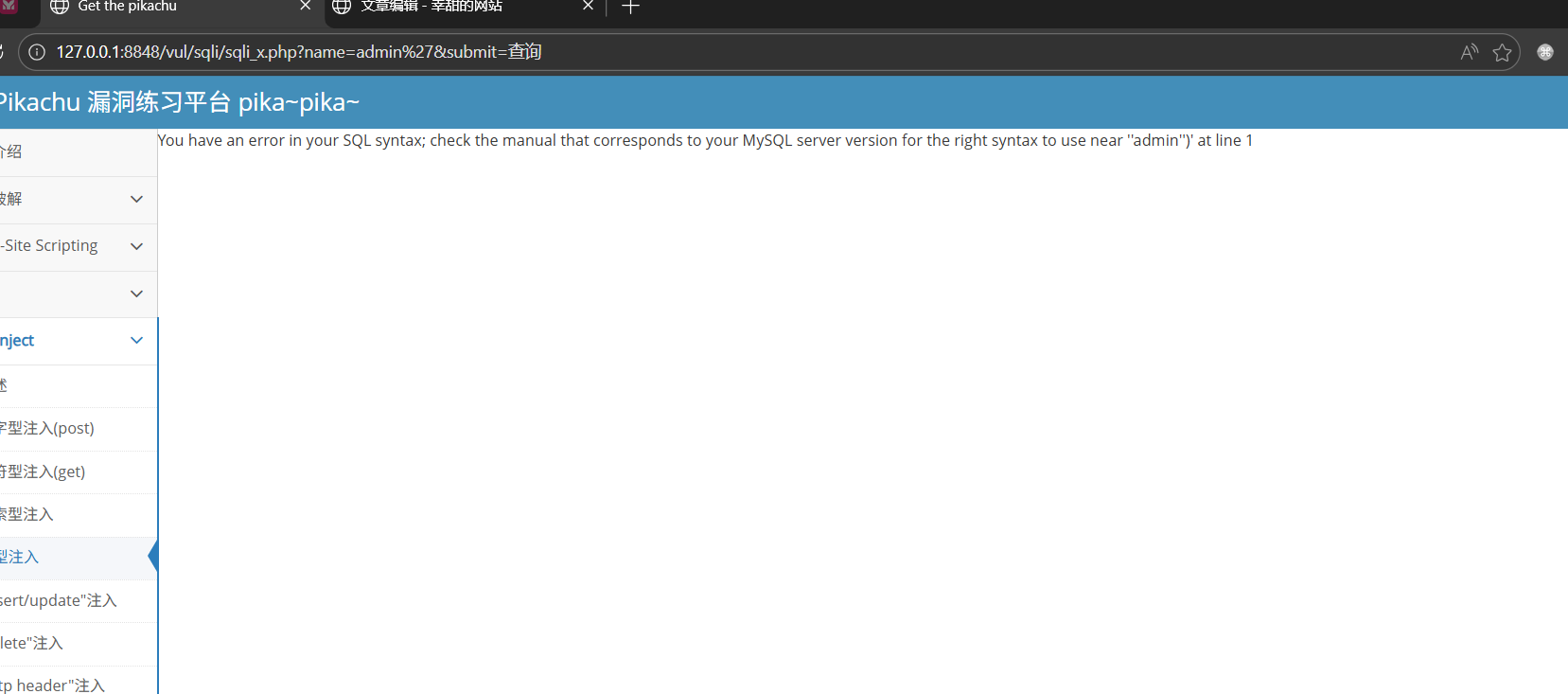 构造这个?name=admin%27报错回显错误说明存在注入点,提示"admin")'