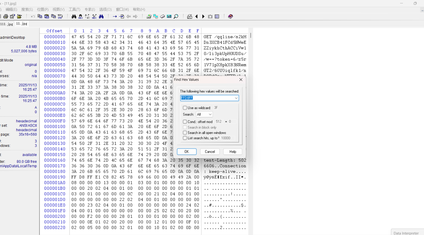 八.点击左上角搜索选择“查找Hex数值”,输入ffd8ff进行查找