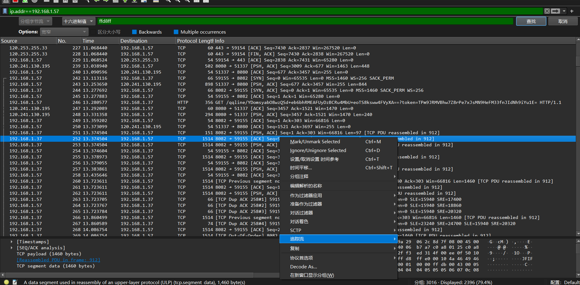 五.右键,点击追踪流,选择TCP追踪流。