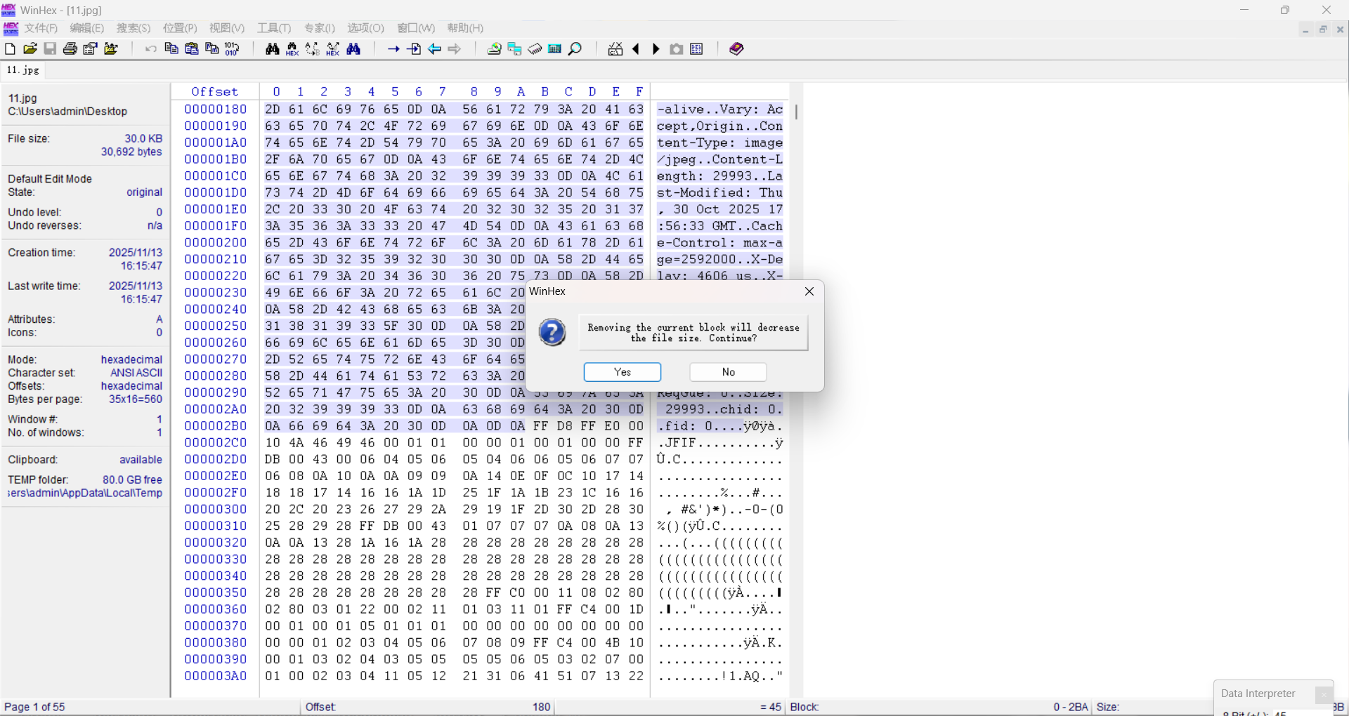 九.查找到后将ffd8ff前的所有删除(右键->编辑->移除),最后·保存就可以还原对应的图片
