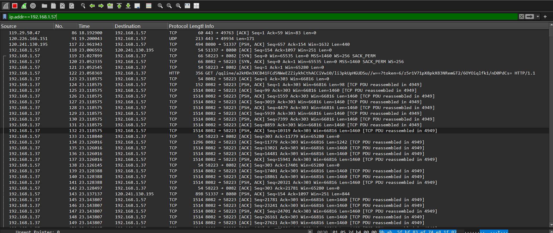 ip.addr == x.x.x.x:抓取源IP 或 目标IP 是该地址的所有数据包。