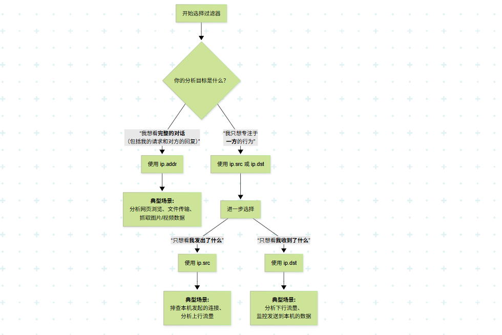 ip.src 是“单项筛选”,而 ip.addr 是“双向捕获”。