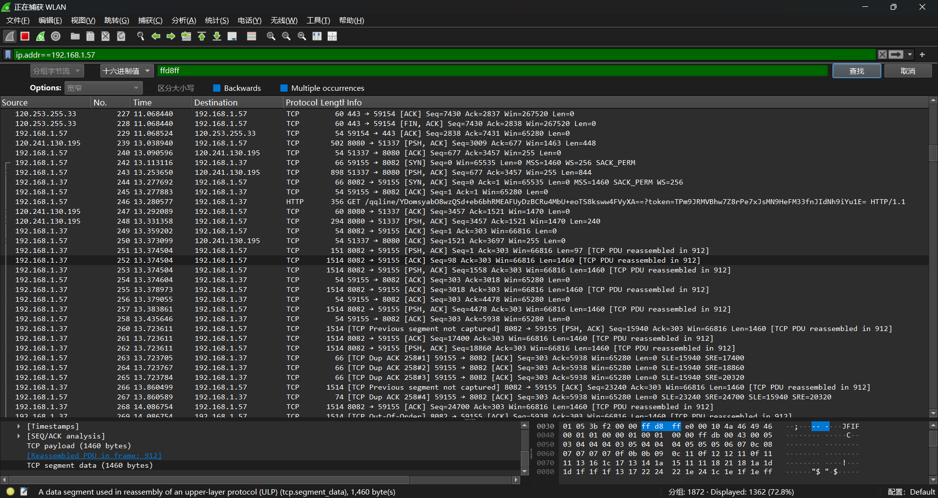 四.按下 Ctrl+F,在查找框中,选择“十六进制值”,然后输入JPEG的文件头标识:ff d8 ff。