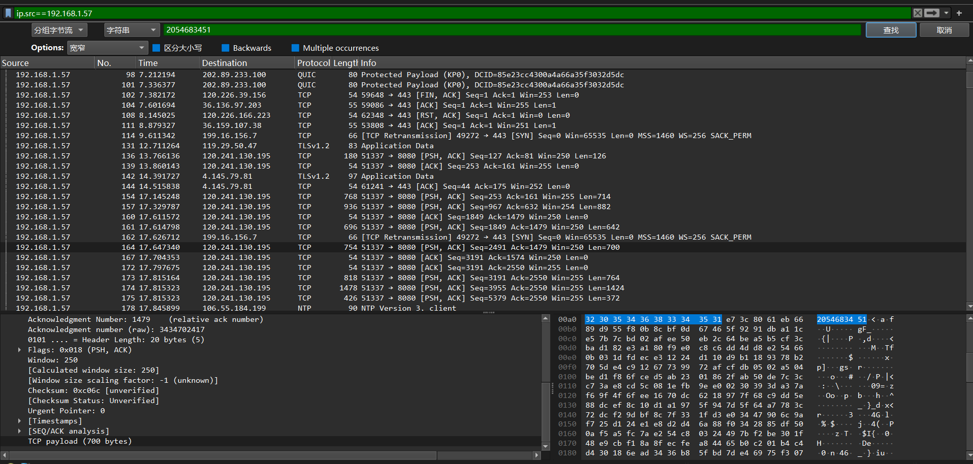 在wireshark“应用显示过滤器”中输入:ip.addr == 你的手机IP,然后回车,过滤出所有与你手机相关的网络数据。
