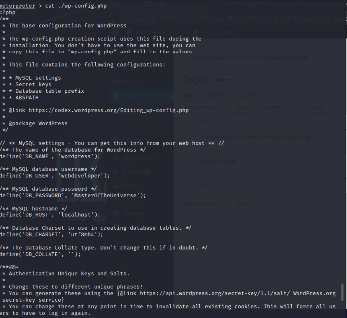 建立会话后,查看wp-config.php获得账号及口令。(配置文件很重要,各种系统的配置文件)。