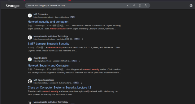 1、用搜索引擎Google或百度搜索麻省理工学院网站中文件名包含“network security”的pdf文档,截图搜索得到的页面。