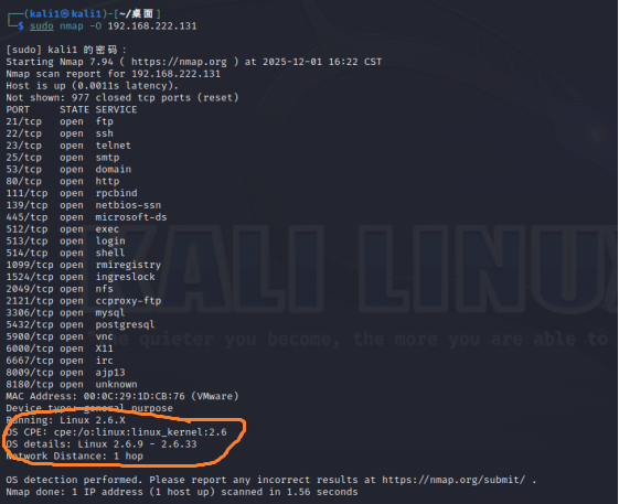5.2利用NMAP扫描Metasploitable2的操作系统类型,并附截图。