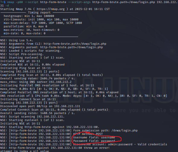 5.3 利用NMAP穷举 Metasploitable2上dvwa的登录账号和密码。