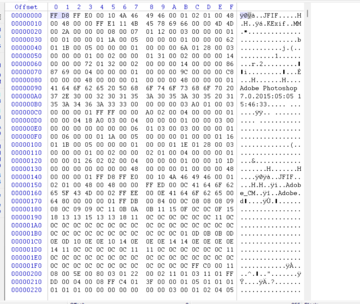 图片显示异常,经 Winhex 分析发现其文件头被修改过。正确的 JPEG 文件头应为 FF D8 FF。应该将其修正为正确格式并保存,即可恢复图片的正常显示。