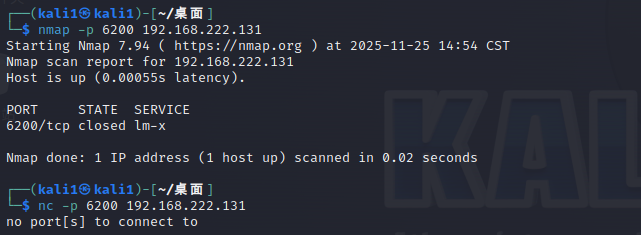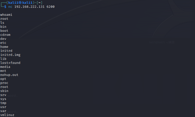(1)打开一个新的终端标签页或窗口,使用Netcat连接靶机悄然开放的6200端口。(nc 192.168.222.131 6200)