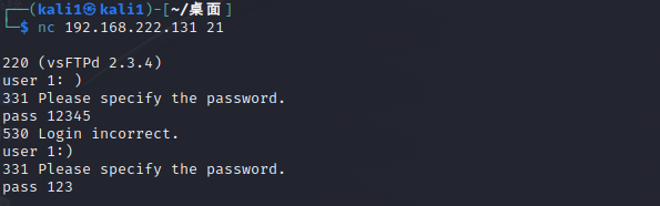 使用Netcat连接靶机的FTP服务(21端口)例如:(nc 192.168.222.131 21)