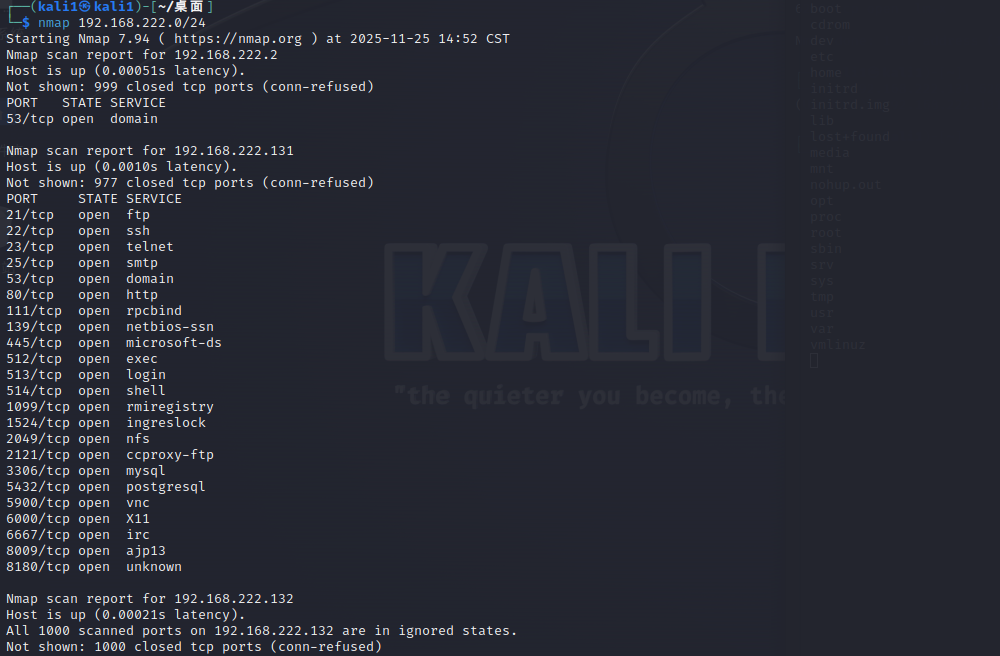 使用Nmap扫描整个网段,寻找存活主机。(nmap 192.168.222.0/24)