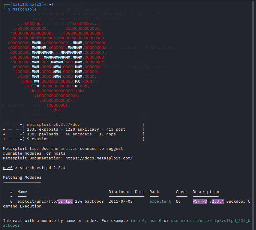 搜索:在 msf6 > 提示符下:(search vsftpd)