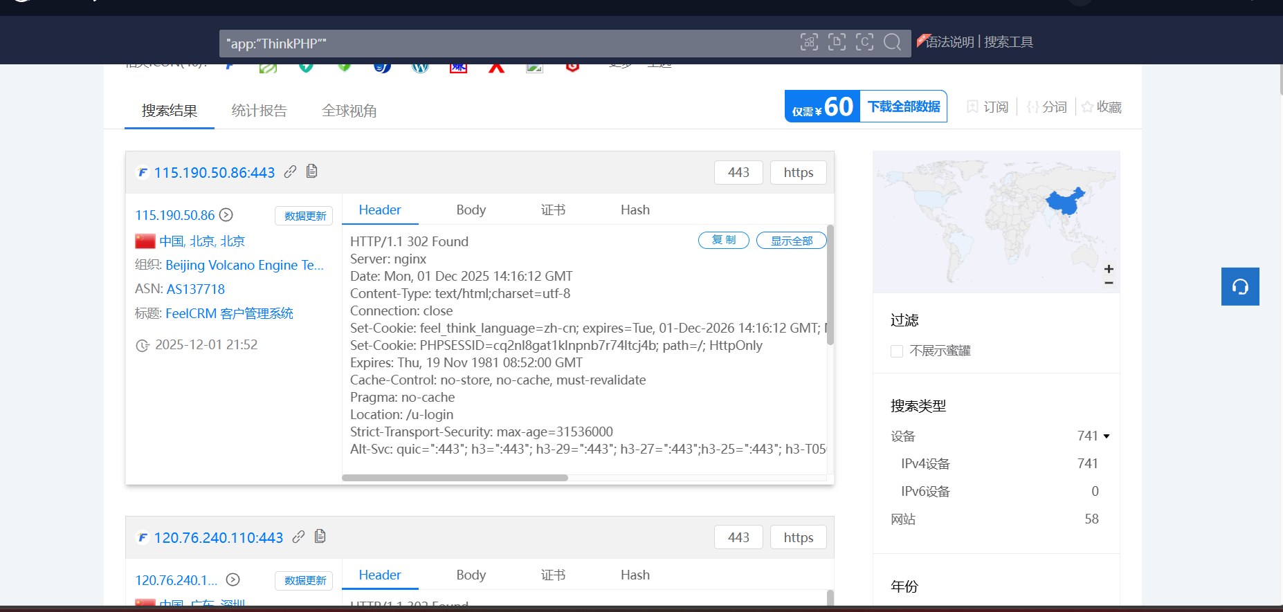 查找特定的 Web 框架:(app:”ThinkPHP” # 查找使用 ThinkPHP 框架的网站)